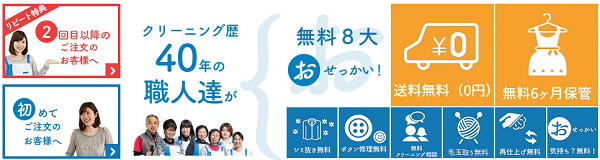 保管料:獣毛製品(カシミヤ、アルパカなど)を除くコート、背広、スーツ類が対象で保管料は1着200円から